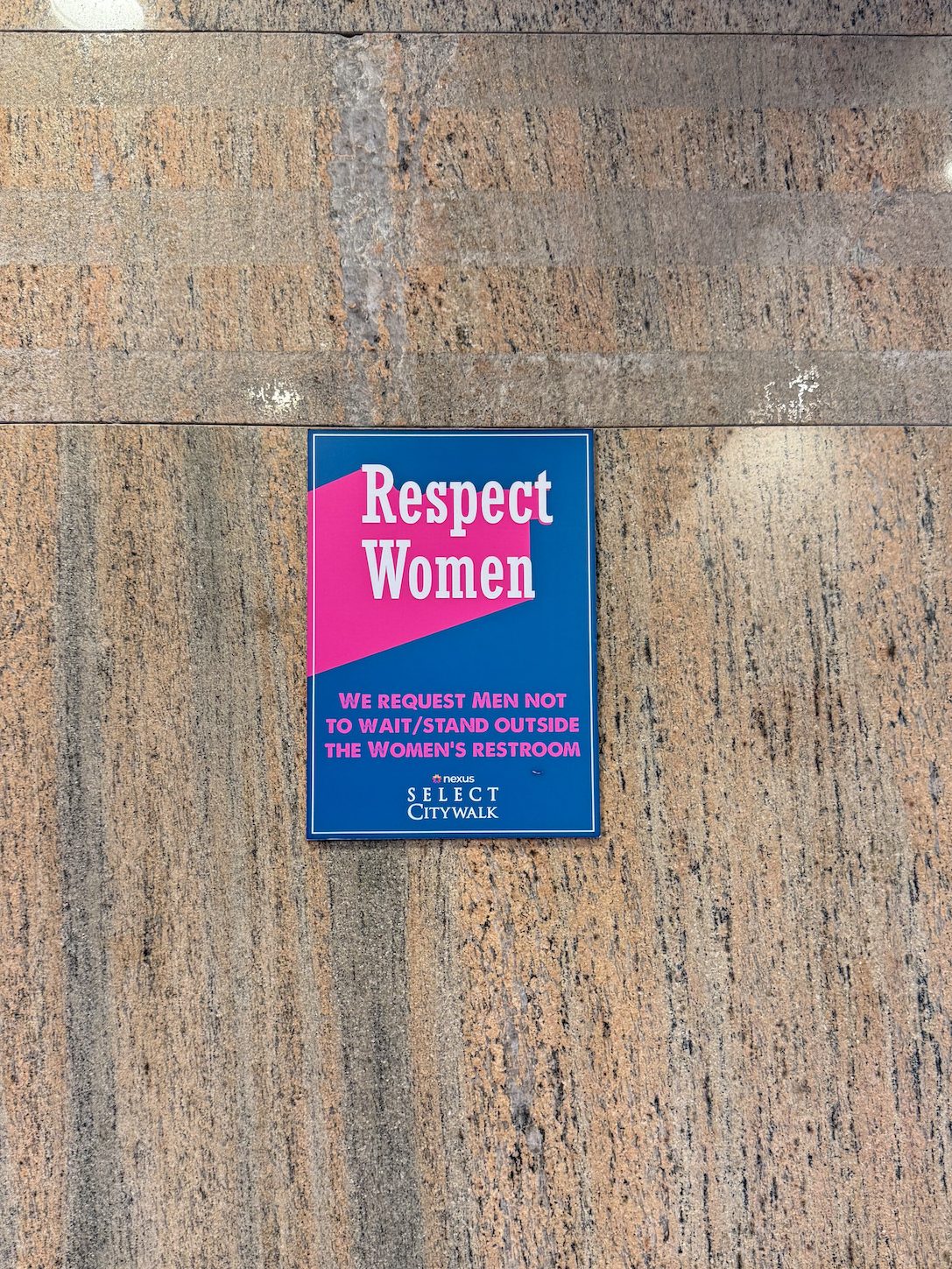 在德里商場的女廁,外面有貼”Respect Women”的宣傳,請男性不要在女廁外逗留/本文作者提供