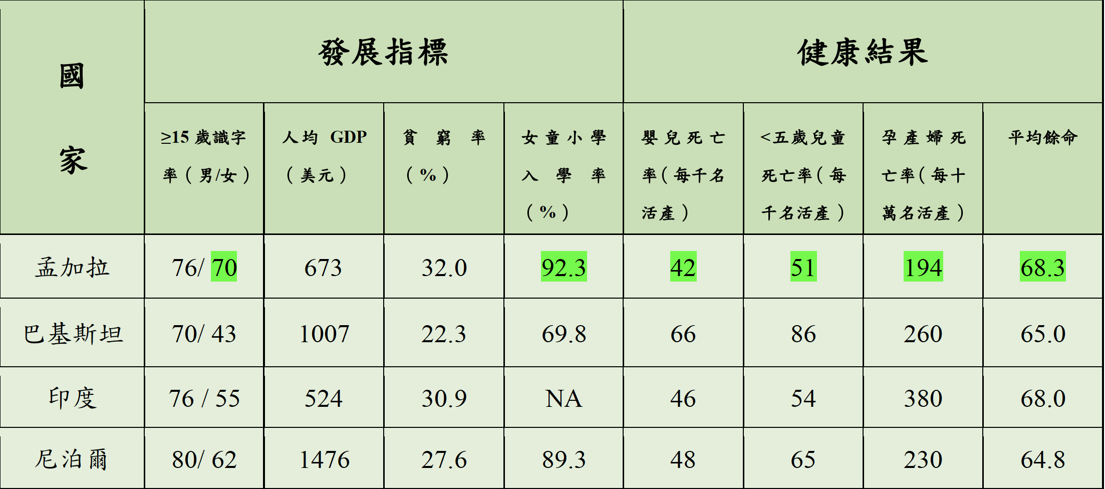 下表是2013年發表在權威醫學期刊刺胳針(Lancet)上,首度指出「孟加拉矛盾」的學術論文中的數據。孟加拉當時的貧窮率是南亞4國最高,但國民並沒有又窮又病。健康指標如嬰兒死亡率、5歲以下兒童死亡率、孕產婦死亡率都是最低,且平均餘命最高。其中最顯著的,是南亞其它3國的15歲以上女性識字率皆在5成上下徘徊時,孟國的女性識字率已來到7成,而且與男性的差距最小。