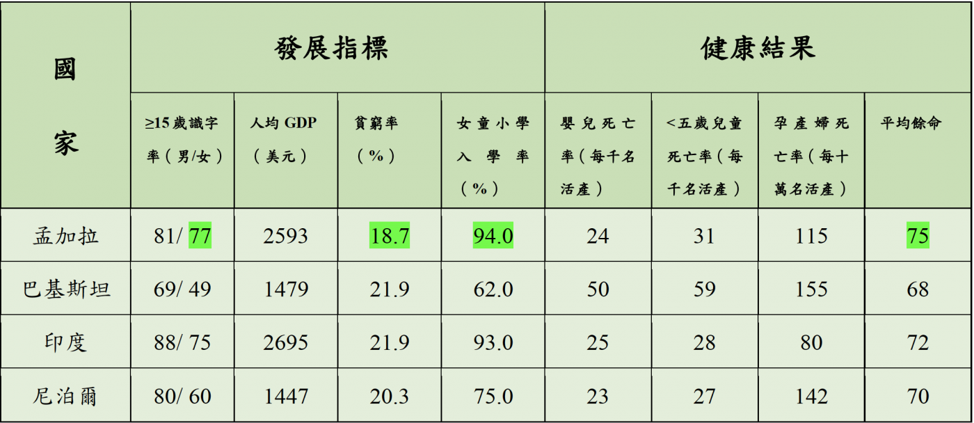 教育改善帶來的效果是長期的。2025年,本文作者從世界銀行(World Bank)與世界衛生組織(WHO)蒐集到的最新資料,顯示孟加拉15歲以上女性識字率和女童入學率這2項社會指標依然穩居南亞之冠,貧窮率反為南亞4國最低,而平均餘命也高於其它3國。