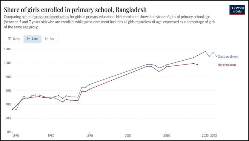 但即使教育的好處很多,並非所有政府都會義無反顧地將資源投資在女童教育上,原因在於女童入學往往受限於地區差距、社會階級與性別規範,即便政策存在,也未必能形成長期穩定的制度效果。孟加拉的社會發展在南亞各國當中相對突出,並被學者稱為「孟加拉矛盾」(Bangladesh Paradox):在整體經濟條件不佳的情況下,卻能在人類發展與健康指標上,交出高於區域平均的成績。